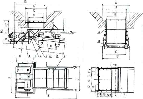 ??1、减速机 2、电动机 3、传动平台 4、联轴器 5、H形架 6、连杆 7、给煤槽 8、闸门 9、机架 10、漏斗 11、托辊