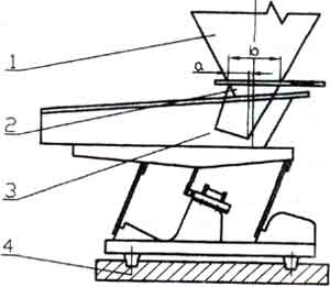 电磁振动给料机的振幅和给料量受料仓仓压影响较大,设计料仓时应尽量减少仓压,使溜咀后侧板承受一定的仓压,并设置斜溜沮及下料闸门。如图,一般a=1/4b。溜咀四周应与给料槽留有一定的间隙,一般5~10mm,以免产生噪音及影响振动。
