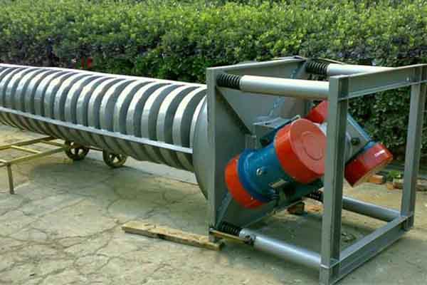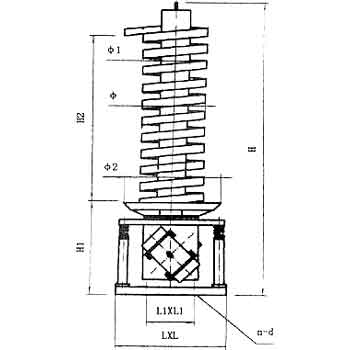 - ZC垂直振动输送机的驱动装置振动电机安装在输送塔下部,两台振动电机对称交叉安装,输送塔由管体和焊接在管体周围的螺旋输送槽组成,输送塔座于减振装置上,减振装置由底座和隔振弹簧组成。
