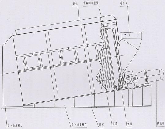 ??抛料式自清扫滚筒筛由壳体、筛筒、筛筒支架、减速机、减速机座几部分组成?;荡傻缍跛倩?,传给齿轮,通过齿轮传动使筛筒旋转。